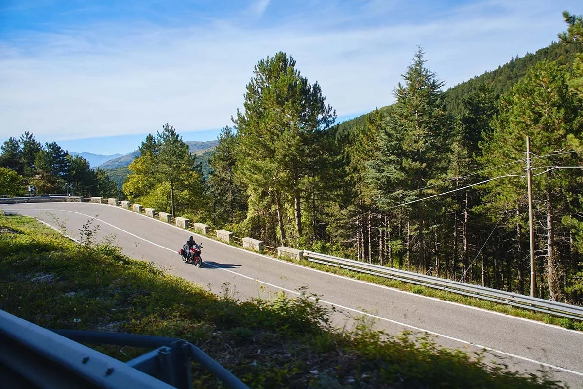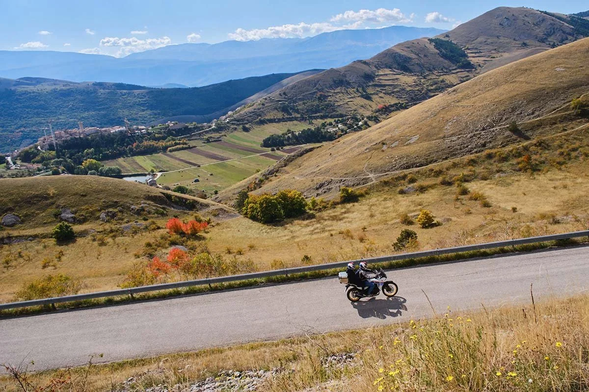 Ride through the stunning and untouched natural parks of central Italy Apennines on a thrilling route packed with twists, turns, and breathtaking mountain views. Perfect for riders seeking more remote riding with very little cars on the road, this scenic journey combines adrenaline and unspoiled Italian landscapes.